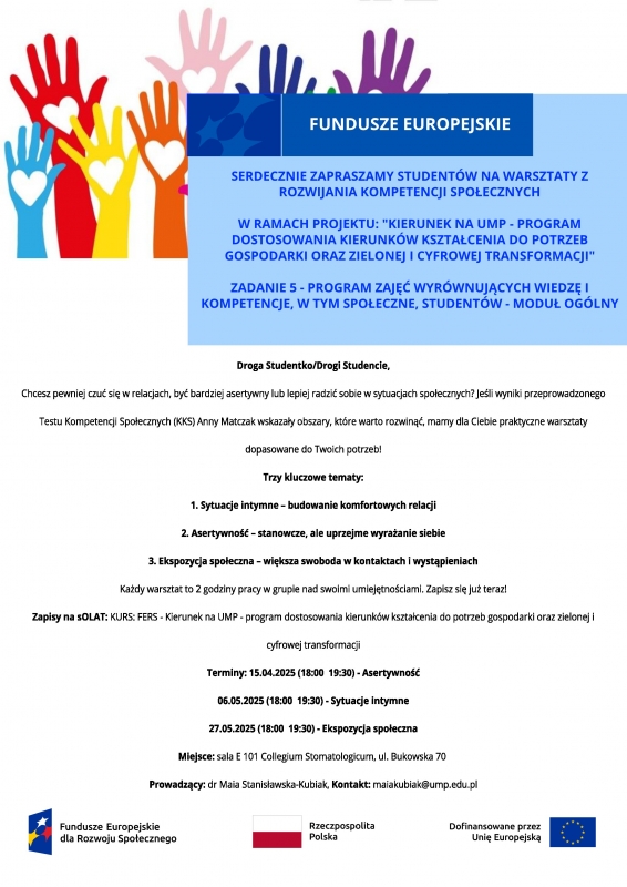 ZAPRASZAMY STUDENTÓW NA WARSZTATY Z ROZWIJANIA KOMPETENCJI SPOŁECZNYCH