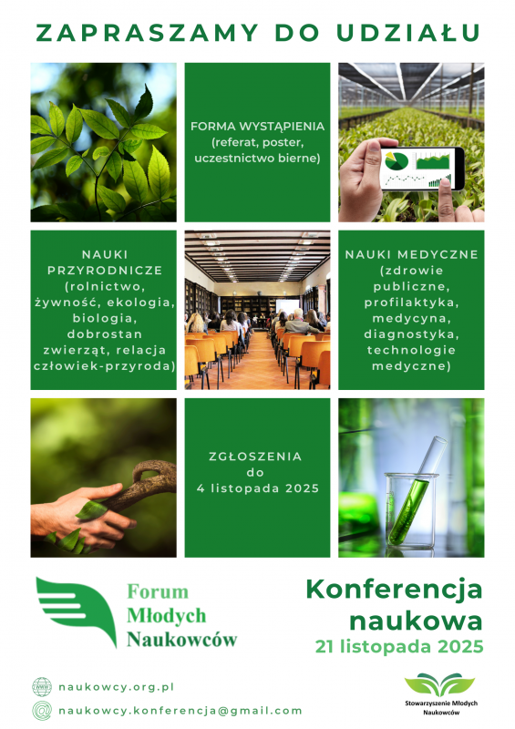 | Szanowni Państwo, Stowarzyszenie Młodych Naukowców zaprasza studentów, doktorantów i młodych naukowców do wzięcia udziału w ogólnopolskiej konferencji naukowej XII Forum Młodych Naukowców „Nauki przyrodnicze i medyczne”, która odbędzie się on-line 21 listopada 2025 r. Celem konferencji jest integracja środowiska naukowego oraz wymiana doświadczeń i poglądów na temat aktualnych osiągnięć, wyzwań i kierunków badań w obszarze nauk przyrodniczych i medycznych. Tematyka konferencji obejmuje dwa główne obszary: Nauki przyrodnicze » Rolnictwo i żywność – produkcja roślinna i zwierzęca, bezpieczeństwo i jakość żywności, agroekologia. » Ekologia i środowisko – ochrona środowiska, bioróżnorodność, zrównoważony rozwój, zmiany klimatu, leśnictwo. » Biologia eksperymentalna i molekularna – mikrobiologia, biotechnologia, genetyka, biologia komórki. » Dobrostan zwierząt i relacje człowiek–przyroda – interakcje człowiek–zwierzę, filozofia i etyka środowiskowa. Nauki medyczne » Zdrowie publiczne i profilaktyka – promocja zdrowia, zdrowie psychiczne, aktywność fizyczna, rehabilitacja, medycyna środowiskowa. » Medycyna kliniczna i terapie – nowoczesne metody leczenia, terapie celowane, farmakologia, medycyna doświadczalna. » Diagnostyka i technologie medyczne – biomarkery, diagnostyka molekularna, nowoczesne technologie w medycynie. Więcej informacji ![]() |