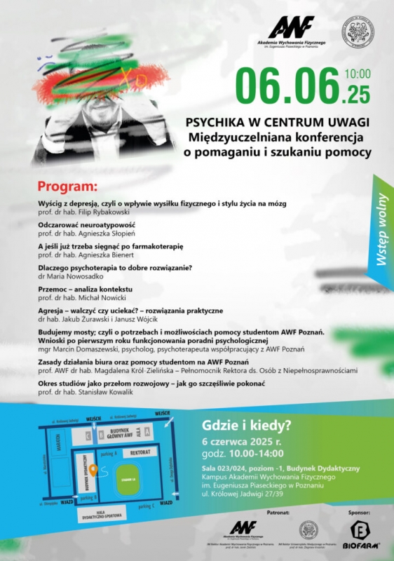 Uniwersytet Medyczny im. Karola Marcinkowskiego w Poznaniu oraz Akademia Wychowania Fizycznego im. Eugeniusza Piaseckiego w Poznaniu serdecznie zapraszają do udziału w II edycji Konferencji „Psychika w centrum uwagi - konferencja o pomaganiu i szukaniu pomocy”, która odbędzie się 12 grudnia 2025 r. w Centrum Kongresowo-Dydaktycznym UMP przy ul. Przybyszewskiego 37a w Poznaniu. Wydarzenie stanowi odpowiedź na narastające wyzwania dotyczące zdrowia psychicznego – trudności w radzeniu sobie z emocjami i stresem, poczucie zagrożenia czy coraz częściej obserwowane zachowania agresywne. Organizatorzy pragną w ten sposób stworzyć przestrzeń do refleksji, dialogu oraz wymiany dobrych praktyk. Konferencja ma charakter szkoleniowy oraz integracyjny, a udział w niej jest bezpłatny. Wydarzenie kierowane jest do studentów, nauczycieli akademickich oraz pracowników administracji uczelni. Tegoroczna edycja zostanie wzbogacona o specjalistyczne warsztaty, które umożliwią uczestnikom rozwijanie kompetencji w zakresie wspierania zdrowia psychicznego oraz reagowania na trudności emocjonalne. Konferencja odbędzie się pod honorowym patronatem Rektora Uniwersytetu Medycznego im. Karola Marcinkowskiego w Poznaniu, prof. dra hab. Zbigniewa Krasińskiego, oraz Rektora Akademii Wychowania Fizycznego w Poznaniu, prof. dra hab. Jacka Zielińskiego. Więcej informacji: